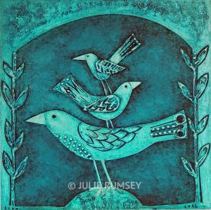 My work in printmaking is inspired by the things in life that I find amusing. Using a combination of pattern, texture and colour, I employ the techniques of monoprint, collagraph, linocut and drypoint etching to create witty and vibrant prints that reflect the rich colour & detail I enjoy.